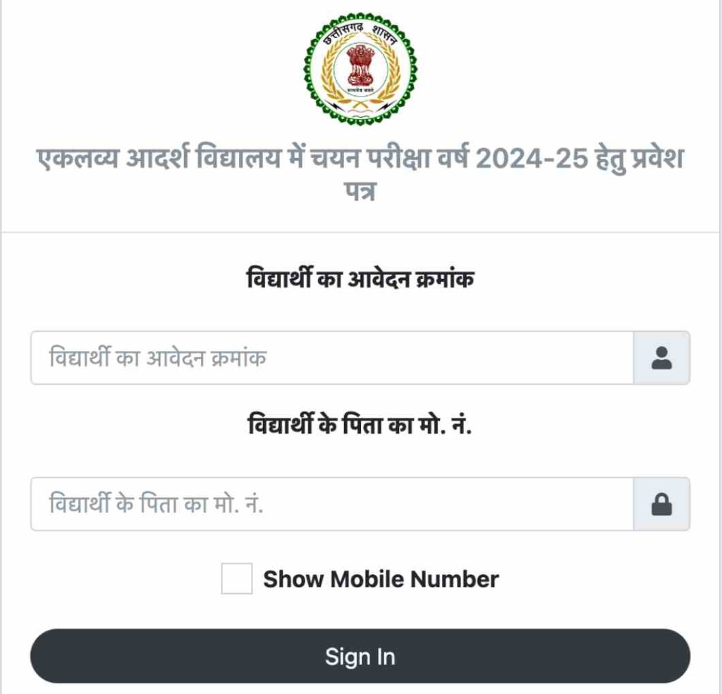 अगर आपको अपने एकलव्य आदर्श आवासीय विद्यालय चयन परीक्षा 2024-2025 हेतु प्रवेश पत्र डाउनलोड करना है तो,आपको सबसे पहले https://eklavya.cg.nic.in/Admit-Card-Login पर जाना होगा ,जिसके बाद आप नीचे दिये गये स्टेप को फ़ॉलो करें !